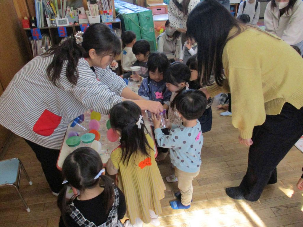 ビーズの入ったコップに風船をかぶせた太鼓を用意しました。それにシールで模様をつけて、オリジナル太鼓が完成しました。みんなで「おもちゃのチャチャチャ」の歌をうたいながら、太鼓をたたいたりシャカシャカ鳴らしたりして、楽しく演奏することができました。幼稚園のお兄さんお姉さんたちも、来週は生活発表会、2月には音楽会があります。今は生活発表会の練習を頑張っています。