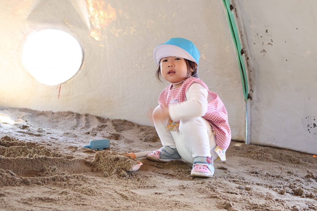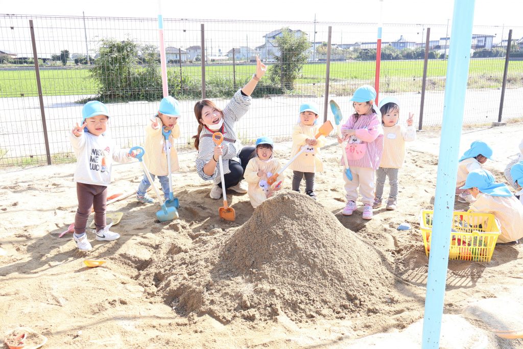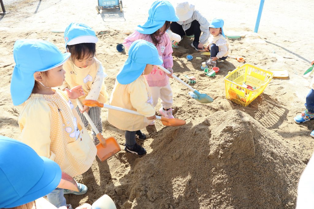 園庭遊びをしました。「大きい幼稚園を作ろう」と言い出した友達に「私もやりたい」と砂場に集まり、みんなで大きな山を作りました。「よいしょ~!」と大きな掛け声を出しながら楽しく作っていた子どもたちです。完成後、みんなで山を壊し最後まで楽しみました。