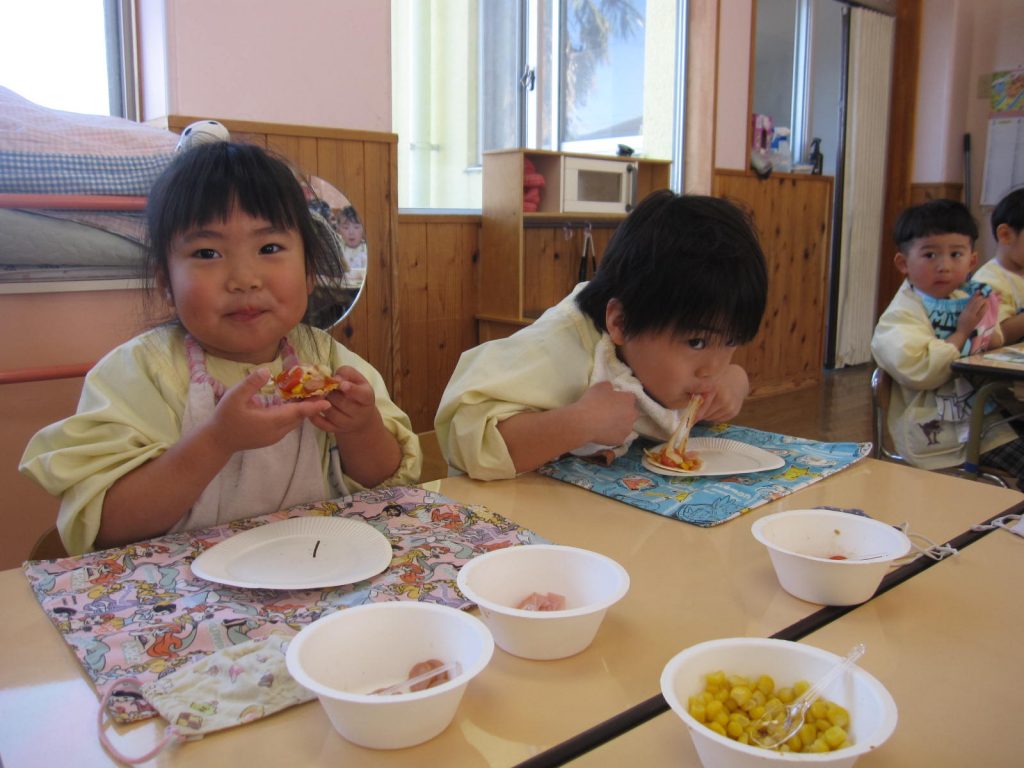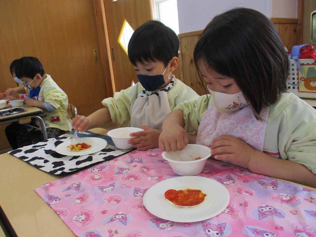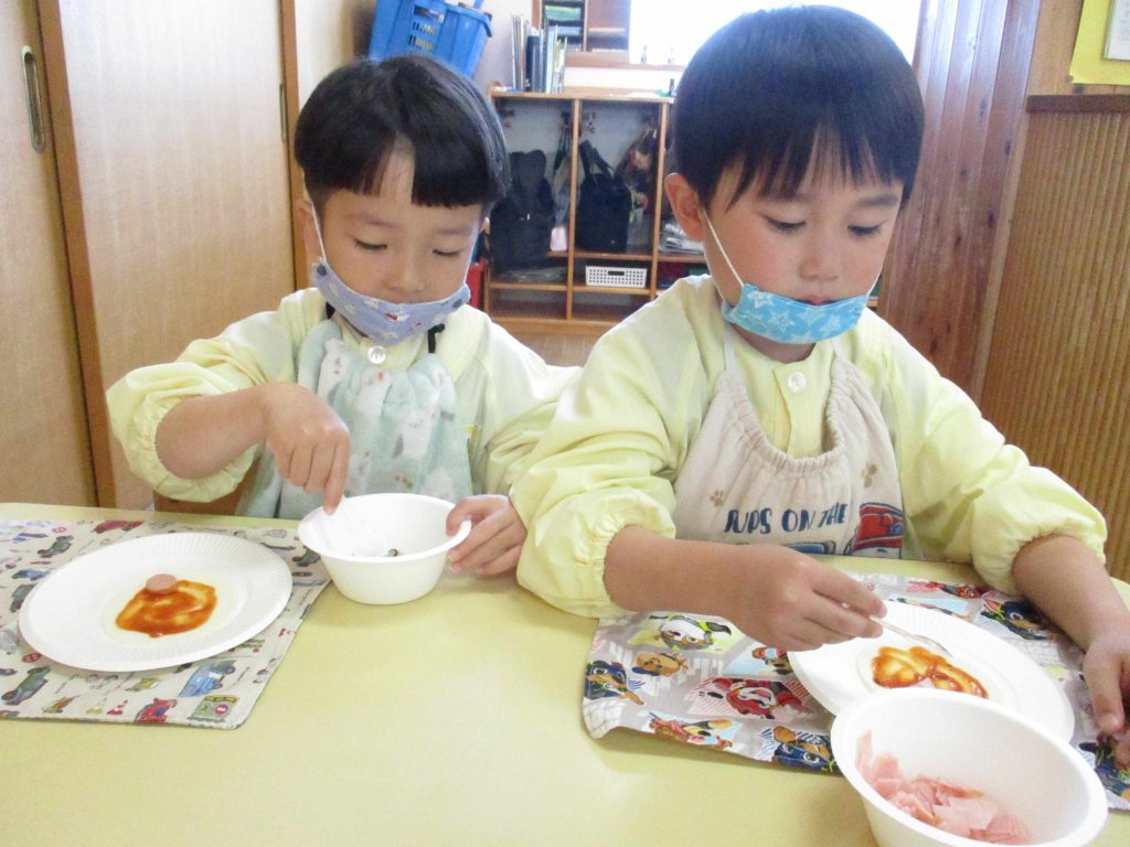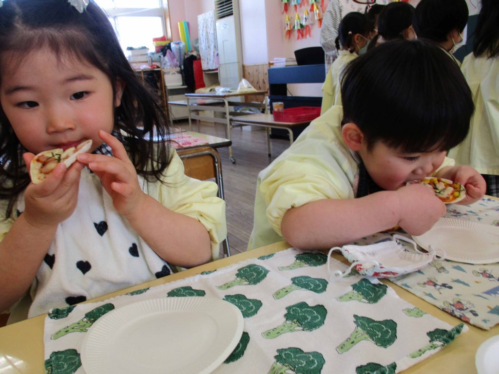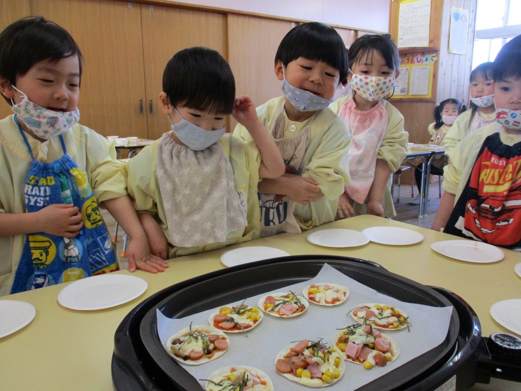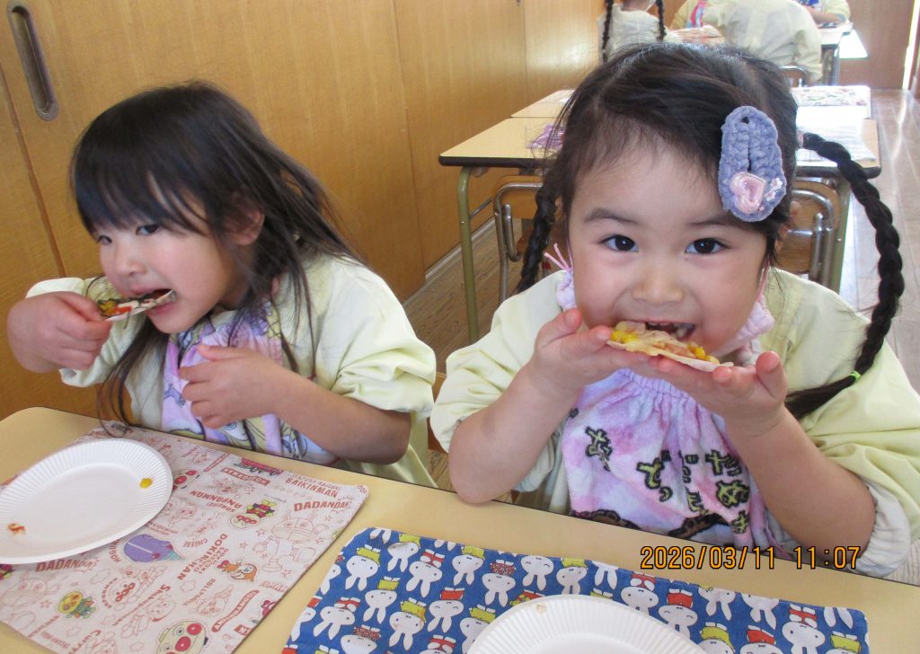 ピザパーティー☆年少 By sakura_dainijikei_master_adminOn 2026年3月12日In 未分類 餃子の皮を使ったピザ作りをしました。 クラスで好きな材料を選びコーンやトマト、しめじなどを入れて作りました。野菜が苦手な子も、自分で作ったピザは美味しく食べることができました♪ <あか> <あお> <きいろ> <もも>