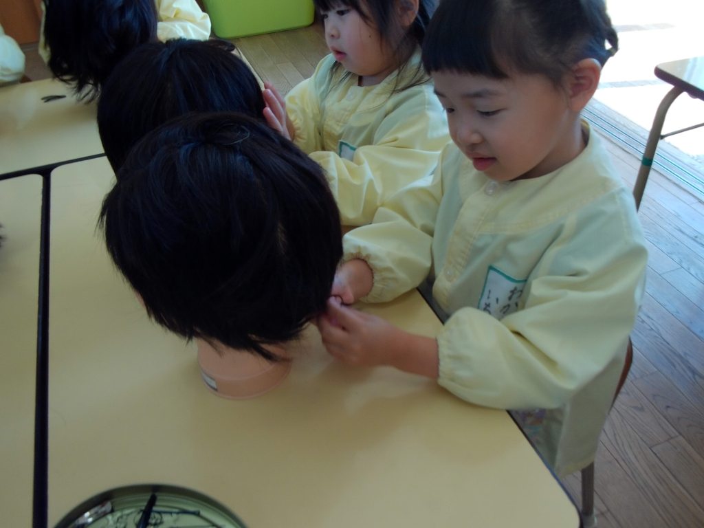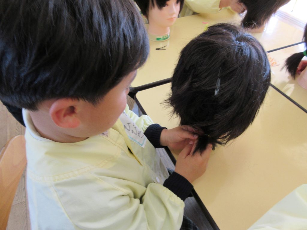ピンやゴムを使って、可愛く髪の毛をアレンジして楽しんでいました。
